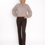 Conjunto elegante con blusa de rayas verticales en tonos marrón y blanco, cuello alto fruncido y manga larga, combinada con pantalón marrón de tiro alto y corte recto ligeramente acampanado. Un look sofisticado que estiliza la figura y aporta un aire profesional y femenino.
