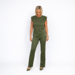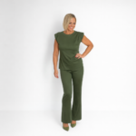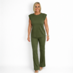 Conjunto monocromático en tono verde oliva, compuesto por blusa sin mangas con hombros estructurados y pantalón de corte recto. Su tejido suave y el diseño minimalista crean un look elegante, cómodo y versátil, ideal para un estilo moderno tanto de día como de noche.