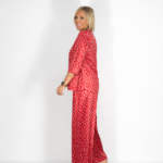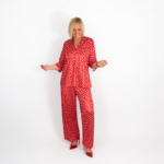 Conjunto moderno y femenino en tono rojo vibrante con estampado de lunares celeste. Incluye blusa de manga larga con caída fluida y pantalón recto de tiro cómodo, ideal para un look elegante pero relajado. Perfecto para destacar en cualquier ocasión con estilo y personalidad.
