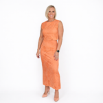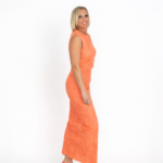 Conjunto top y falda midi en color naranja con diseño calado que aporta un estilo fresco y elegante. Cuenta con corte recto, manga sisa y tejido ligero que se adapta cómodamente al cuerpo, ideal para eventos de día, verano o looks casual chic. Su diseño femenino y sofisticado lo convierte en una prenda versátil que puedes combinar con sandalias o tacones.