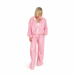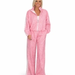 Conjunto deportivo femenino de dos piezas con estampado animal print en tono rosa. La chaqueta cuenta con cierre frontal de cremallera, cuello alto y detalles de franjas laterales en contraste que estilizan la silueta. El pantalón es de corte amplio y cómodo, con cintura elástica y caída fluida que aporta movimiento y sofisticación.