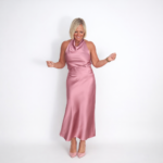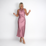 Top de satén con escote tipo halter que aporta un toque sofisticado y moderno. Falda midi de caída fluida que estiliza la figura y brinda movimiento natural al caminar. Ideal para eventos, cenas o look chic de día.
