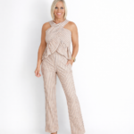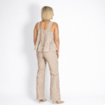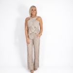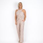 Conjunto elegante de top y pantalón en tonos neutros con delicado estampado de rayas. El top cruzado aporta un toque sofisticado y femenino, mientras que el pantalón de corte recto estiliza la figura y brinda comodidad. Ideal para lucir chic en cualquier ocasión, desde un evento casual hasta una salida especial.