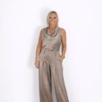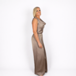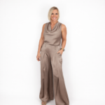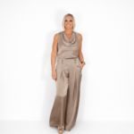 Conjunto elegante de dos piezas en tono taupe con acabado satinado. Incluye blusa sin mangas con cuello drapeado que aporta un toque sofisticado y pantalón de tiro alto con pernera ancha que estiliza la silueta y brinda comodidad. Ideal para ocasiones especiales, eventos o para lograr un look moderno y refinado. ✨