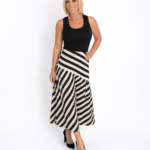 Falda midi elegante con diseño de rayas en blanco y negro que aporta un estilo moderno y sofisticado. Su corte fluido y ligero crea un movimiento natural al caminar, mientras que el patrón de rayas diagonales estiliza la silueta y añade un toque distintivo al look.
