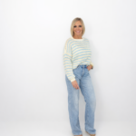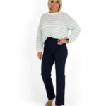 Un conjunto cómodo y elegante que estiliza al instante. El suéter de punto en tono claro con rayas azules aporta frescura y suavidad, mientras que el pantalón azul marino de tiro alto y corte recto define la silueta con un acabado sofisticado y versátil.