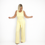 Mono largo en tono amarillo suave. Diseño elegante sin mangas, con cinturón que realza la figura y pantalón fluido para máxima comodidad. Perfecto para un look fresco, femenino y sofisticado en cualquier ocasión.