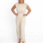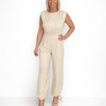 Mono largo en tono beige, de diseño elegante y minimalista. Cuenta con escote cerrado, hombros sutilmente estructurados y cintura fruncida que estiliza la figura. El detalle de lazada en los tobillos aporta un toque femenino y sofisticado. Ideal para eventos, cenas o looks de oficina con un aire chic y atemporal.