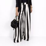 Pantalón palazzo de tiro alto con diseño de rayas verticales en blanco y negro. Confeccionado en tejido ligero y fluido que aporta movimiento y estiliza la silueta. Presenta cintura alta con pretina estructurada que realza la figura y cierre discreto para un acabado limpio. Su corte amplio y recto alarga visualmente las piernas, convirtiéndolo en […]