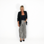 Pantalón de tejido tejano con diseño de rayas verticales en blanco y negro, ideal para estilizar la figura. De tiro alto y corte recto, ofrece un ajuste cómodo y favorecedor. Cuenta con cierre de botón y bolsillos funcionales, perfecto para combinar con blusas o tops y crear looks modernos y elegantes para cualquier ocasión.