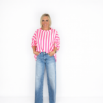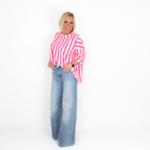 Sudadera de rayas verticales en rosa y blanco, con corte holgado y manga larga ligeramente abullonada. Un diseño cómodo, fresco y muy favorecedor que estiliza gracias a su patrón vertical y aporta un toque vibrante a cualquier look casual.
