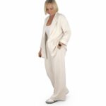 Conjunto de dos piezas en tono beige que transmite frescura y elegancia relajada. Está compuesto por una blazer fluida de corte recto con solapa clásica y cierre frontal de botón, y un pantalón amplio de pernera ancha con cintura elástica que aporta comodidad sin renunciar al estilo.