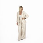 Conjunto de dos piezas en tono beige que transmite frescura y elegancia relajada. Está compuesto por una blazer fluida de corte recto con solapa clásica y cierre frontal de botón, y un pantalón amplio de pernera ancha con cintura elástica que aporta comodidad sin renunciar al estilo. Confeccionado en un tejido ligero y suave al […]