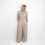 Este conjunto de dos piezas destaca por su elegancia relajada y su estética sofisticada. Compuesto por una chaqueta estructurada y un pantalón de corte amplio, ofrece un look equilibrado entre lo clásico y lo contemporáneo. Su tono neutro y su diseño cuidado lo convierten en una opción versátil y atemporal, ideal para mujeres que buscan estilo sin renunciar a la comodidad.