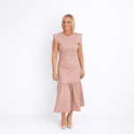 Vestido midi en tono rosa empolvado, de diseño elegante y femenino. Presenta hombros estructurados que estilizan la silueta, cuerpo entallado que realza la figura y falda con volante en el bajo que aporta movimiento y sofisticación. Ideal para eventos, oficina o ocasiones especiales.