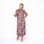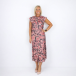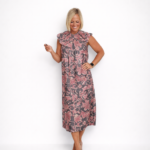 Vestido midi con estampado floral en tonos rosados y fondo oscuro. Diseño elegante con cuello fruncido y mangas sutiles, ideal para lucir femenina y sofisticada en cualquier ocasión. Combínalo con tacones o sandalias y destaca sin esfuerzo.