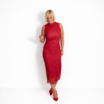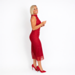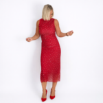 Vestido de tul rojo con delicados lunares, diseño ajustado que realza la figura y largo midi elegante. Perfecto para destacar con un look femenino, sofisticado y lleno de actitud.